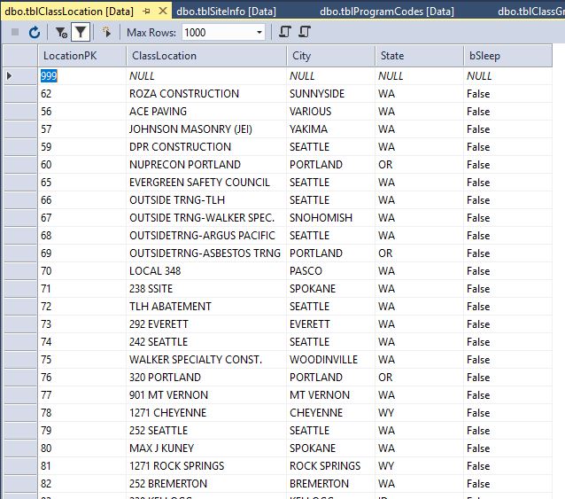 - There is a database table called classLocations. It has been explained this table lists the LIUNA Id's for each location that must be included when a course is grant funded. The list below is created using the exact same fields currently in the data base. There are currently 159 active entries in this table. There are 64 inactive entries for a total of 223 entries.