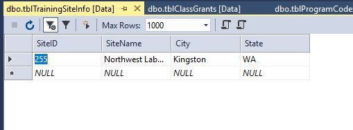 - trainingSiteInfo Table has only one entry. I am told that the currently each NWLETT training location has been assigned a number which is used for courses. The information is as follows. Kingston = 1, Pasco = 3, Utah = 4, Spokane = 5, Satsop = 6, and Des Moines = 8; This really should be a data base table so information can be consistently restored and retrieved.